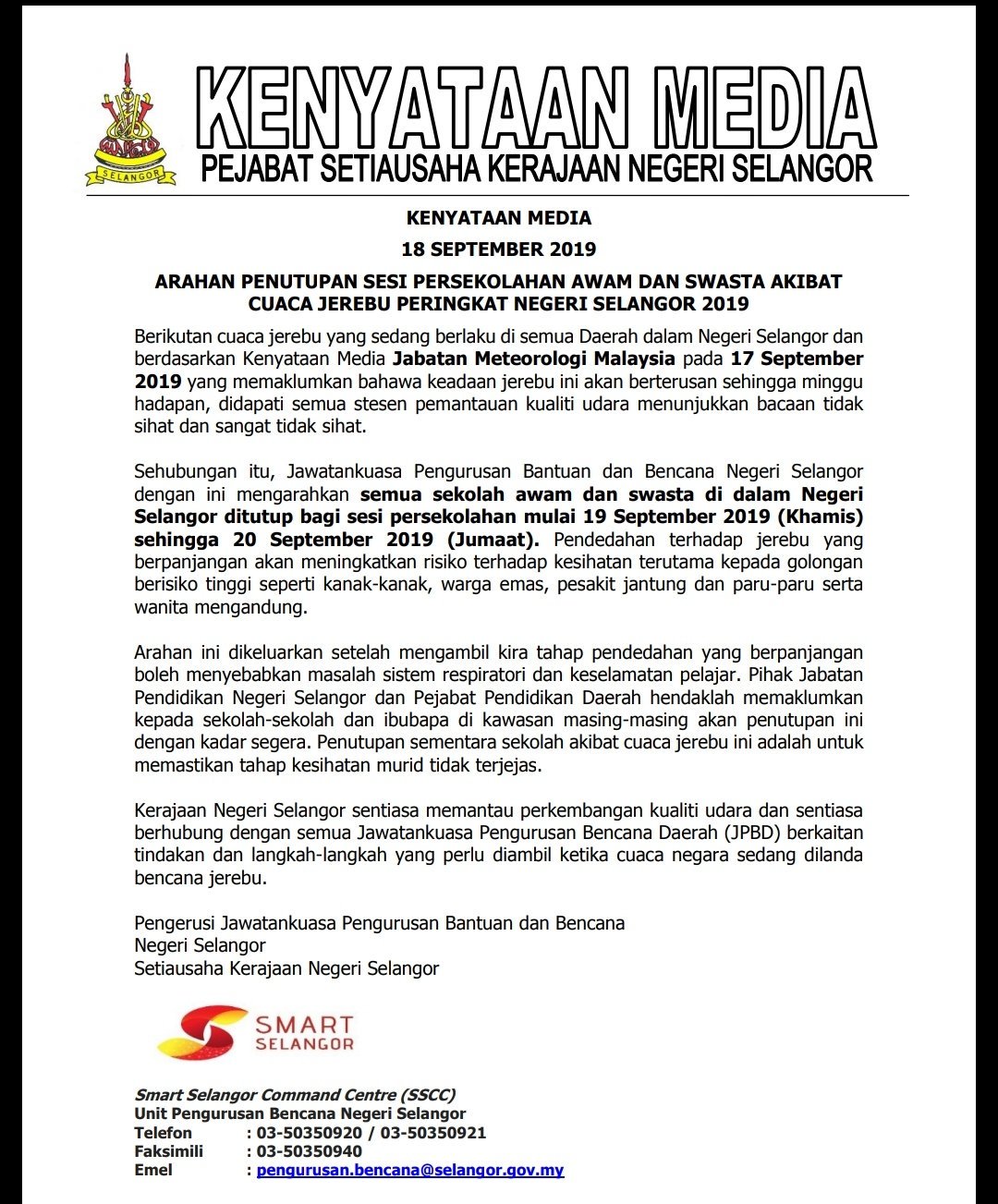 Kkmalaysia V Twitter Semua Sekolah Awam Dan Swasta Di Selangor Diarah Tutup Pada Khamis Dan Jumaat Ekoran Jerebu Setiausaha Kerajaan Selangor Https T Co 9bsjajhsyd Twitter